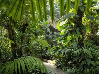 Belépve érezhetően más környezet fogad. Magas páratartalom, nagy pálmák, banánok, más egzotikus növények. Egyszerűen egy jól kialakított és karbantartott trópusi üvegházba csöppenünk, ahol úgy sétálgathatunk, mintha egy esőerdőben lennénk. A végében egy vízesés és egy nagy szikla adja meg a plusz hangulatát a háznak. Lépcső is vezet fel a sziklában, fentről pedig madártávlatból is ránézhetünk a növényekre. A szikla belsejéből egy ajtó vezet át egy kisebb, mediterrán üvegházba, ahol a növények és egy kőből épült fal nagyszerű kontrasztot alkot. Itt is van egy kijárat, de ne menjünk ki, ugyanis a főbejárathoz – ez esetben a főkijárathoz – egy üvegfolyosó vezet vissza, amely a kaktusz- és pozsgásgyűjteményt tartalmazza.